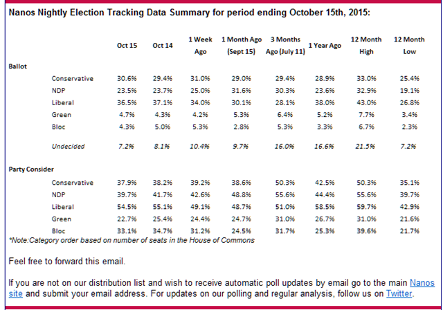 Nanos Nightly Ballot Tracking: Liberal (36.5%), Conservative (30.6%), NDP (23.5%), Green (4.7%) – Three-day Tracking Ending October 15th