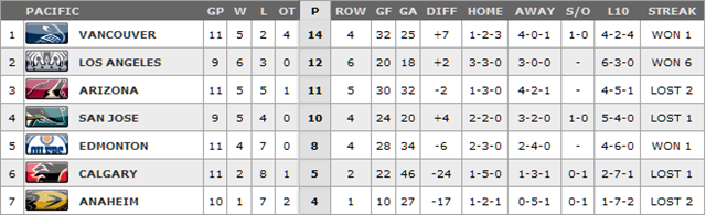 The Canucks are currently in 1rst-place with 14-points, two points ahead of second place, Los Angeles, in the Pacific Division of the Western Conference. Arizona is in 3rd place, with 11-points, with San Jose one point behind the Coyotes, who are in 4rth place with 10-points. Los Angeles and San Jose both have 2-games in hand on both Vancouver and Arizona.