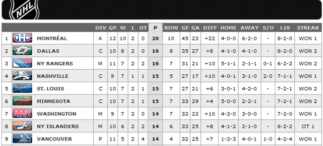 Vancouver is among the top 9-teams in the NHL, and are tied for 4rth best team in the league with their 14-points. The Montreal Canadians are the top team with 20-points, with 2-loss and 10-wins, all wins in regulation play, followed by both Dallas and the New York Rangers with 16-points. Nashville, St. Louis and Minnesota are tied for 3rd place in the league with 15-points.