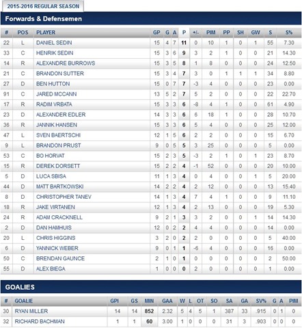 Daniel Sedin leads the Canucks in scoring with 11-points, followed by brother Henrik with 9-points and Alex Burrows with 8-points. Brandon Sutter, rookies Ben Hutton and Jared McCann are next with 7-points each. Radim Vrbata, Alex Edler, Jannik Hansen and Sven Baertschi closely follow with 6-points. Brandon Prust and Bo Horvat are on their skate blades with 5-points each.