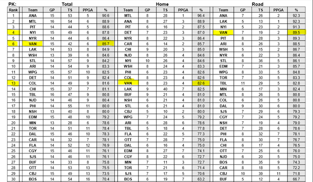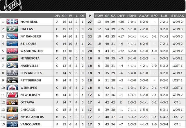 Canucks are among the top 15-teams in the NHL, and are tied for the 7th best team in the league with their 17-points. The Montreal Canadians are the top team with 27-points, with a record of 13-2-1, all wins in regulation play. Dallas Stars are inching their way closer with 24-points to the top spot in 2nd place.