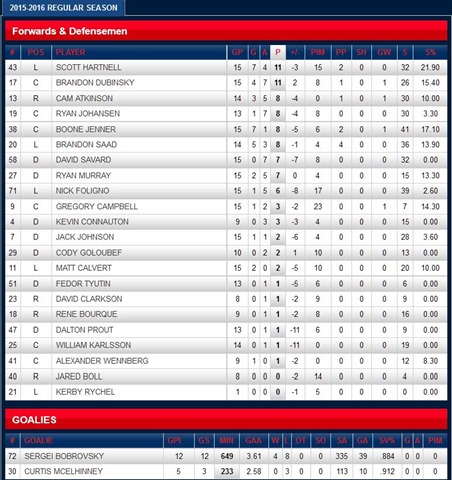 For Columbus, Scott Hartnell and Brandon Dubinsky lead the Blue Jackets with 11-points each; followed by Cam Atkinson, Ryan Johansen, Boone Jenner and Brandon Saad with 8-points each.