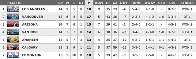 The Canucks are in 2nd place with 17 points, a single point behind Los Angeles in the Pacific Division of the Western Conference, who are in top spot with 18-points; 3-points ahead of Arizona, who are alone in 3rd place. San Jose is currently is in 4rth place with 14-points, 1-point ahead of Anaheim in 5th place with 13-points. Calgary and Edmonton have 11 and 10-points respectively.