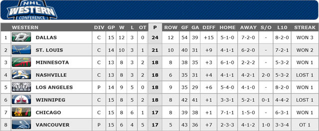Vancouver is among the top 8-teams in the Western Conference, and are tied for the 4rth best team in the conference with their 17-points. The Dallas Stars are at the top of the conference with 24-points, currently sporting an 12-3 record in their 15-games, 4-points ahead of the St. Louis Blues.