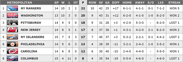 The New York Rangers are currently in top spot with 22-points; followed by Washington in 2nd spot with 20-points; Pittsburgh in 3rd with 18-points. New Jersey and the New York Islanders are tied for 4rth position with 17-points each. Philadelphia and Carolina round out the rest of the division with 13 and 12-points respectively.