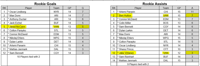 Rookie Jared McCann leads the Canucks as the top sniper with 5-goals in 13-games played. Daniel Sedin and rookie Ben Hutton are tied for most assists on the team with 7-assists each.