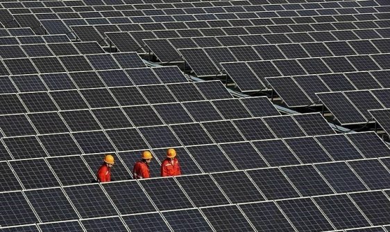 Workers walk among newly installed solar panels at a solar power plant in Zhouquan township of Tongxiang, Zhejiang province in China on December 18, 2014. Credit: REUTERS/Stringer