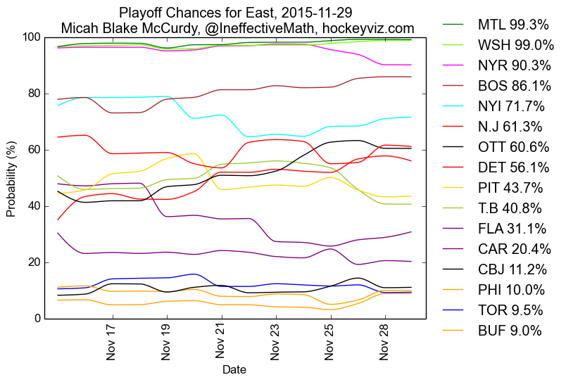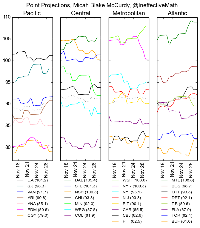For the NHL 2015-2016 season, he has been making projections on final points for the teams and teams that would make the playoffs, among other things.