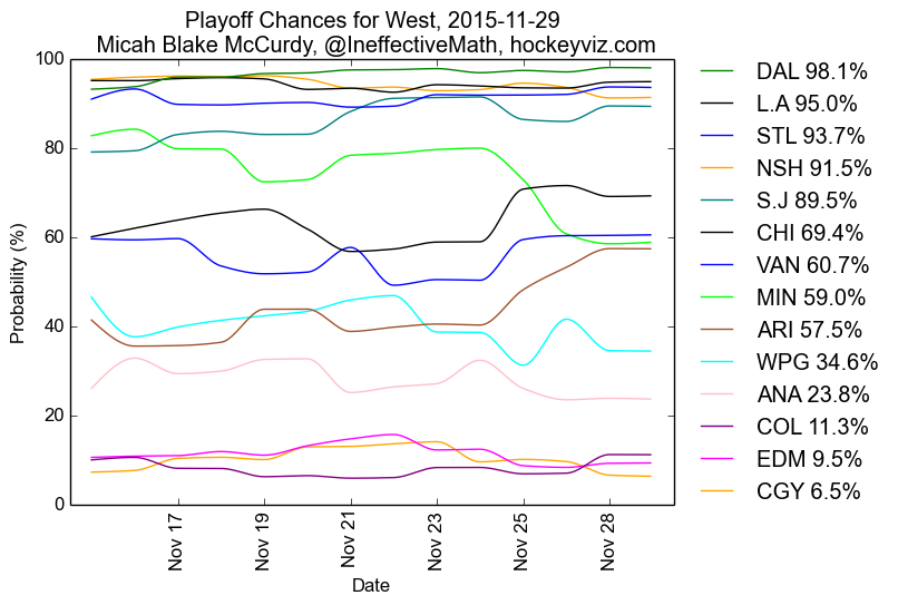 Based on the work of Micah Blake McCurdy, at this point of the season, Vancouver is likely to “squeak” into the playoffs, just ahead of Arizona, by a point or two. And the Canucks have a 60.7 per cent chance of finishing the season as the 8th best team in the Western Conference, just ahead of Minnesota.