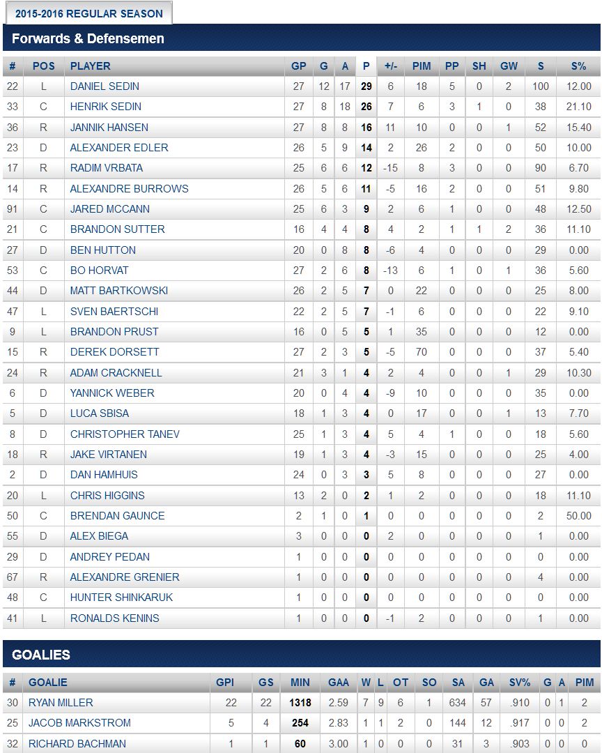 Canucks statistics courtesy of the NHL and Vancouver Canucks.