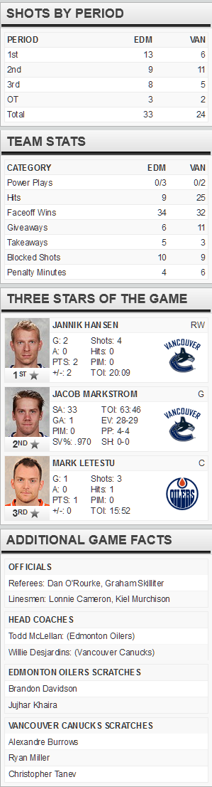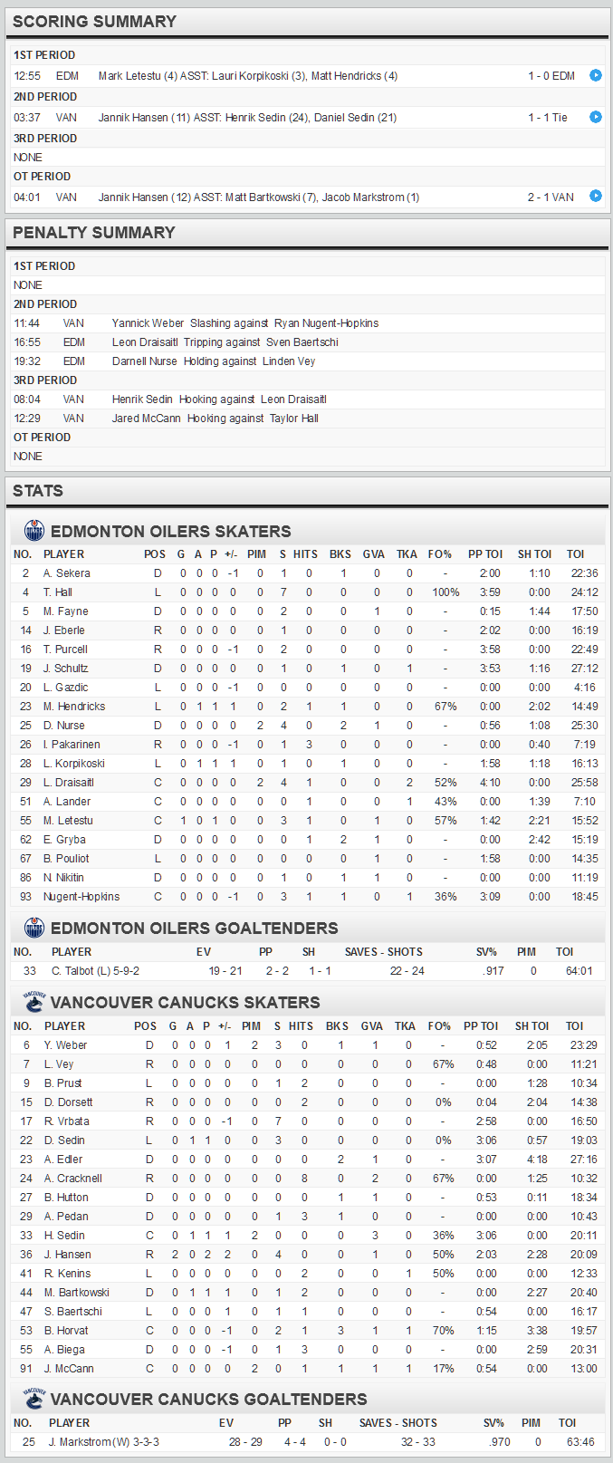 But it would take the return of injured Jannick Hansen for Vancouver to win the game in overtime, as he came down the right side, over the Edmonton blue line, and let a slap shot go that Talbot could not stop, giving the Vancouver Canucks a 2-1 overtime win at 4:01.