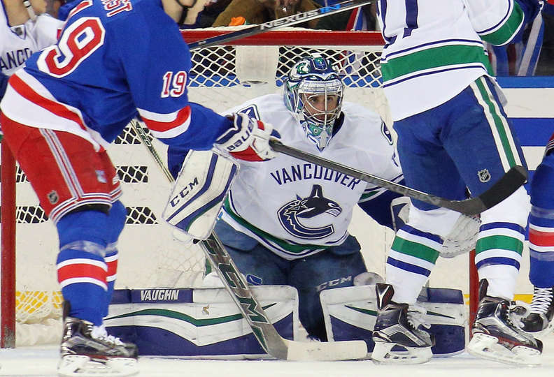 NEW YORK, NY – JANUARY 19: Ryan Miller #30 of the Vancouver Canucks keeps his eyes on the puck during the first period against the New York Rangers at Madison Square Garden on January 19, 2016 in New York City. (Photo by Bruce Bennett/Getty Images)