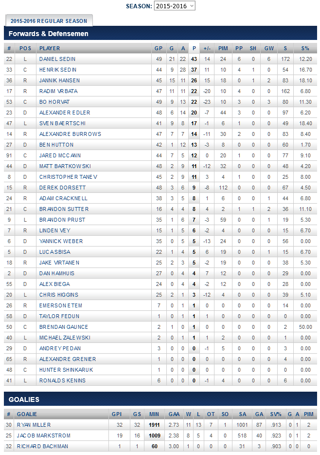 STATISTICS COURTESY OF THE NHL AND VANCOUVER CANUCKS