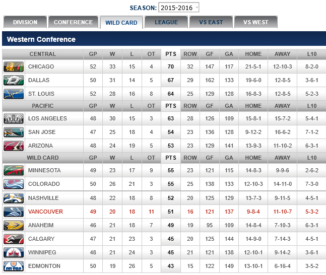 Vancouver as of today, are in 4rth place in their division, 3 points behind 2nd place San Jose; 2 points behind Arizona in 3rd place, looking for opponents of their division adversaries, to do what they can, to give them help in making the playoffs this season. Anaheim are on the Canucks coat tails, 2 points behind the Canucks; Calgary are 6 points back, with Edmonton, 10 points out of a playoff spot.