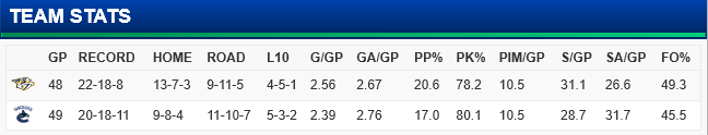 The Vancouver Canucks (20-18-11) host the Nashville Predators (22-18-8) tonight at Rogers Place, beginning a three game home stand.