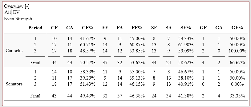 - EV 5v5—Senators-43; Canucks-44
