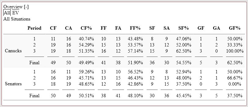 - All Strengths—Senators-50; Canucks-49