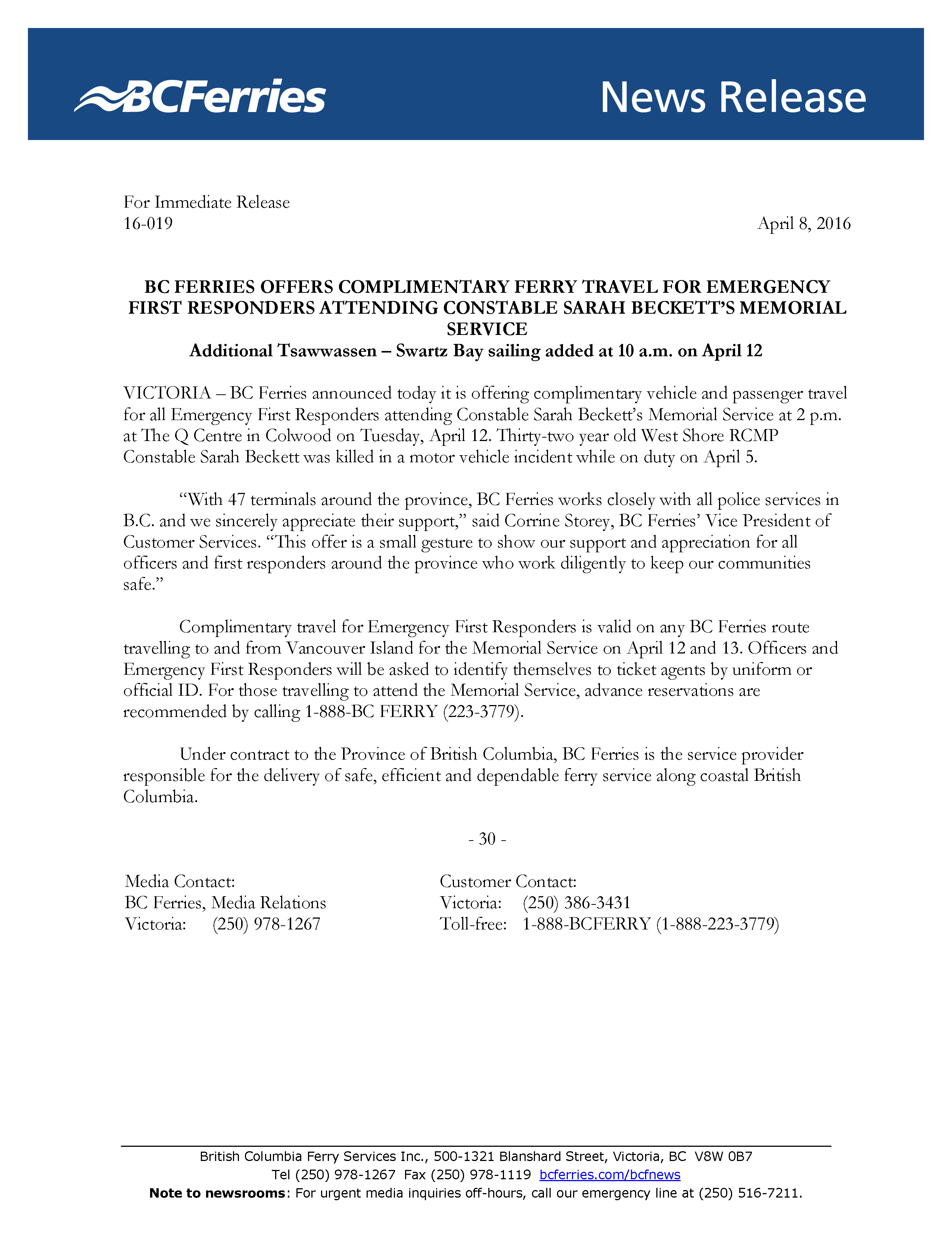 BC FERRIES OFFERS COMPLIMENTARY FERRY TRAVEL FOR EMERGENCY FIRST RESPONDERS ATTENDING CONSTABLE SARAH BECKETT’S MEMORIAL SERVICE Posted on April 8, 2016 by CanucksBanter Additional Tsawwassen – Swartz Bay sailing added at 10 a.m. on April 12 Share this: Print (Opens in new window) Print Share on Facebook (Opens in new window) Facebook Share on X (Opens in new window) X Email a link to a friend (Opens in new window) Email Like Loading... Related