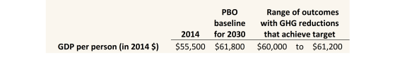 The needed changes will, however, necessarily impact on the economy since non-GHG sources of energy are currently more costly than cheap coal, natural gas or even oil products. The estimate used in the PBO report indicates that incomes could be reduced by between 1 and 3 per cent, relative to where PBO projects they would otherwise be.
