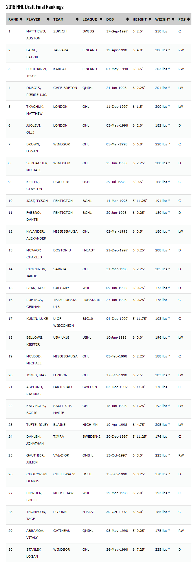 2016 NHL Draft Rankings: HockeyProspect.com Final Top 30