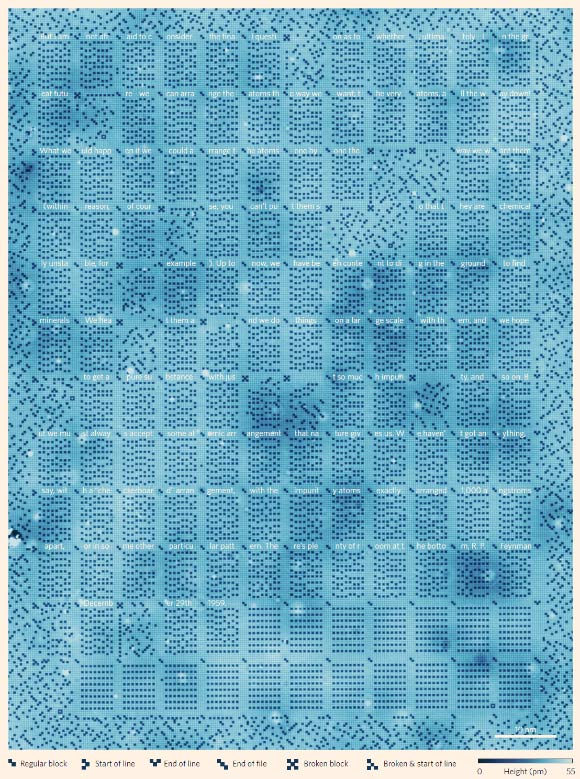 STM image (96 x 126 nm) of a 1,016-byte atomic memory, written to a passage from physicist Richard Feynman’s lecture ‘There’s plenty of room at the bottom.’ The various markers used are explained in the legend below the images. The memory consists of 127 functional blocks and 17 broken blocks. Image credit: F.E. Kalff et al.