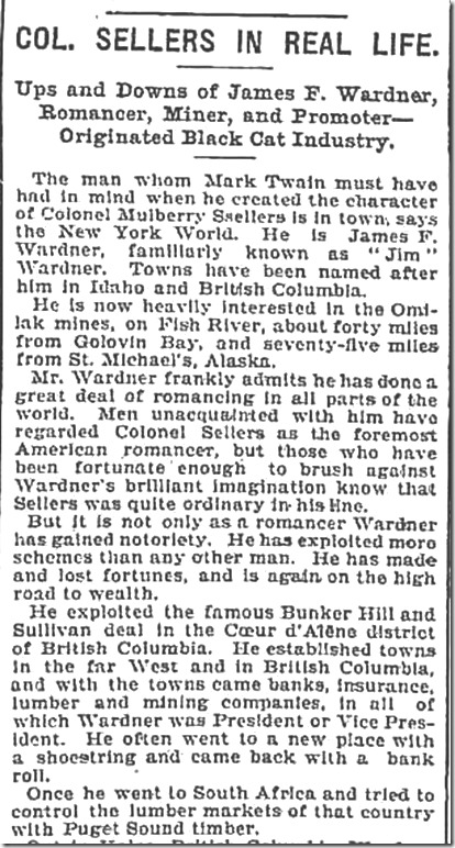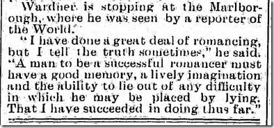 Note: The above referenced newspapers carried the same article from the New York World, with the following differences: The Tribune titled their article, “An Expert Liar: ‘Jim’ Wardner Admits That He Has A Wonderfully Good Memory”; and, the final paragraph, which appeared in the The Tribune but not the Chicago Tribune. The original article appeared in the New York (Evening) World on February 3, 1899.