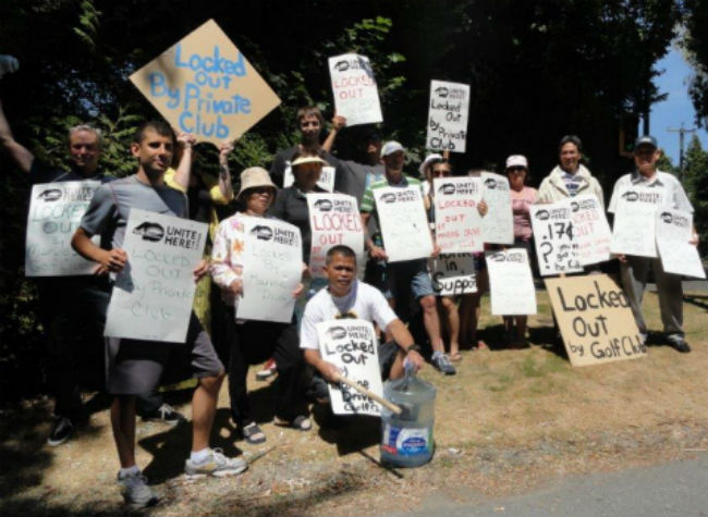 The lockout of food and beverage workers by the exclusive Marine Drive Golf Club has now entered its third week. The Club, one of Vancouver’s most prestigious private golf clubs in which an initiation fee can cost $75,000, locked out its servers, cooks, bartenders, locker room attendants and janitors on July 26. The lockout affects 48 workers who work in the Bullpen (Men’s Lounge), the Mixed Grill, the dining room as well as those who work in the women and men’s locker rooms. Many of the workers are long-term employees of the Club, some with more than 30 years of service.