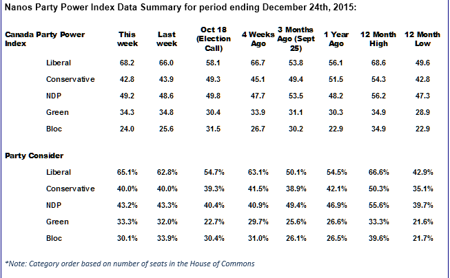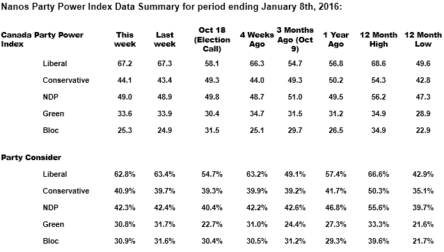 - Nanos Party Power Index – The Index, which is a composite of a series of question on ballot preferences and impressions of the leaders has the federal Liberal Party remaining near a one year high over the holiday period. The Liberals scored 68.2 out of a possible 100 points, followed by the New Democrats who scored 49.2 points, the Conservatives 42.8 points, the Greens 34.2 points and the BQ 24.0 points (QC only). Of note, the Conservatives hit a 12 month low over the holidays.