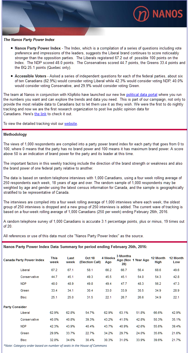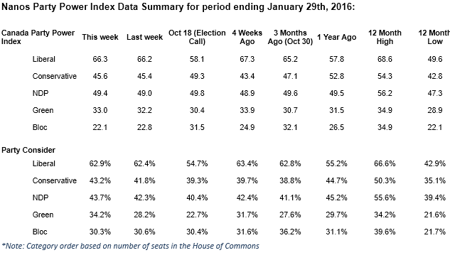 Liberals continue to score best on Nanos Party Power Index (ending February 5, 2016)