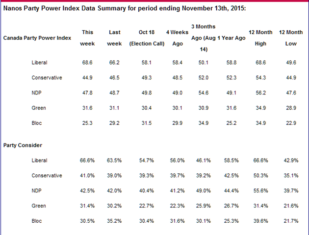 Liberals hit yet another high on Nanos Party Power Index – Nanos Weekly Tracking (ending November 13, 2015)