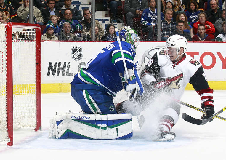 VANCOUVER, BC – JANUARY 4: Jacob Markstrom #25 of the Vancouver Canucks looks on as Laurent Dauphin #76 of the Arizona Coyotes skates in to the net during their NHL game at Rogers Arena January 4, 2016 in Vancouver, British Columbia, Canada. Arizona won 3-2. (Photo by Jeff Vinnick/NHLI via Getty Images)