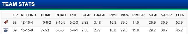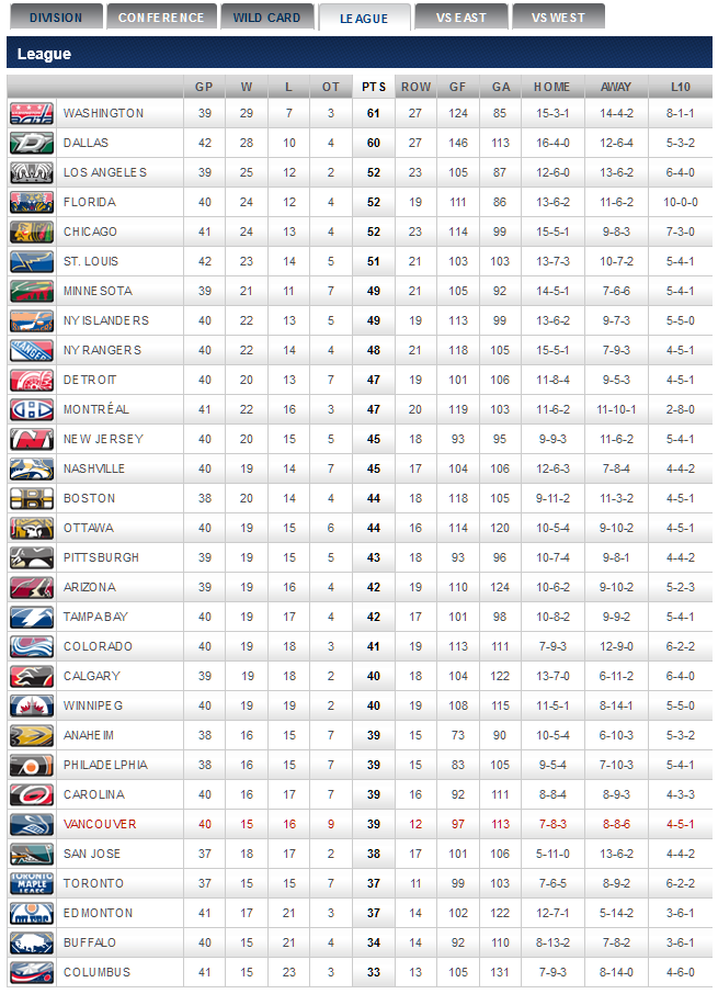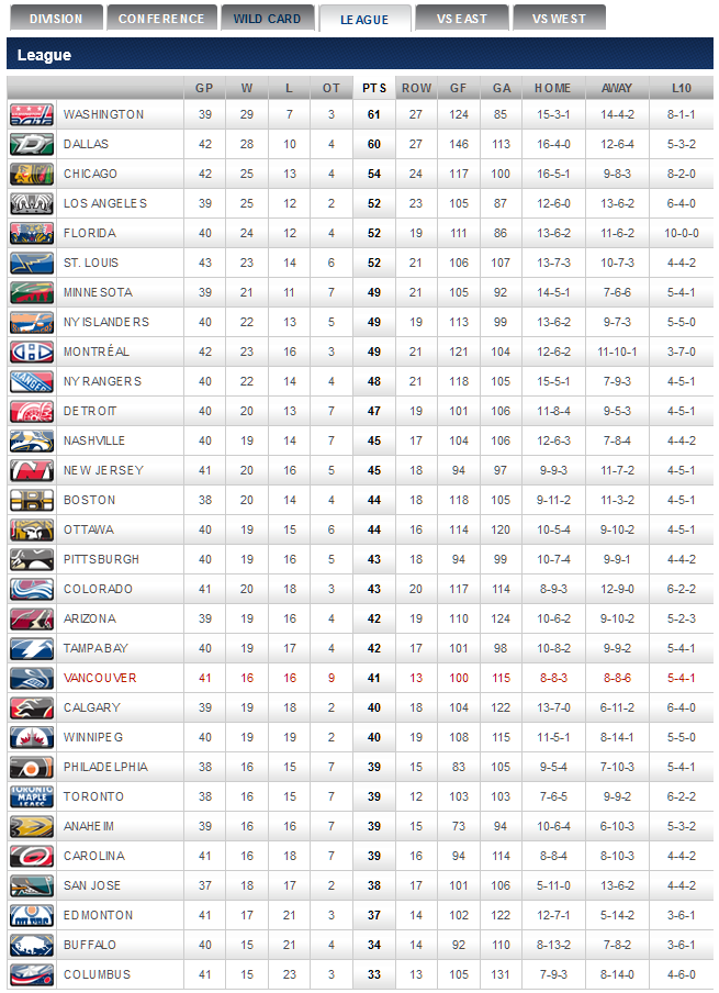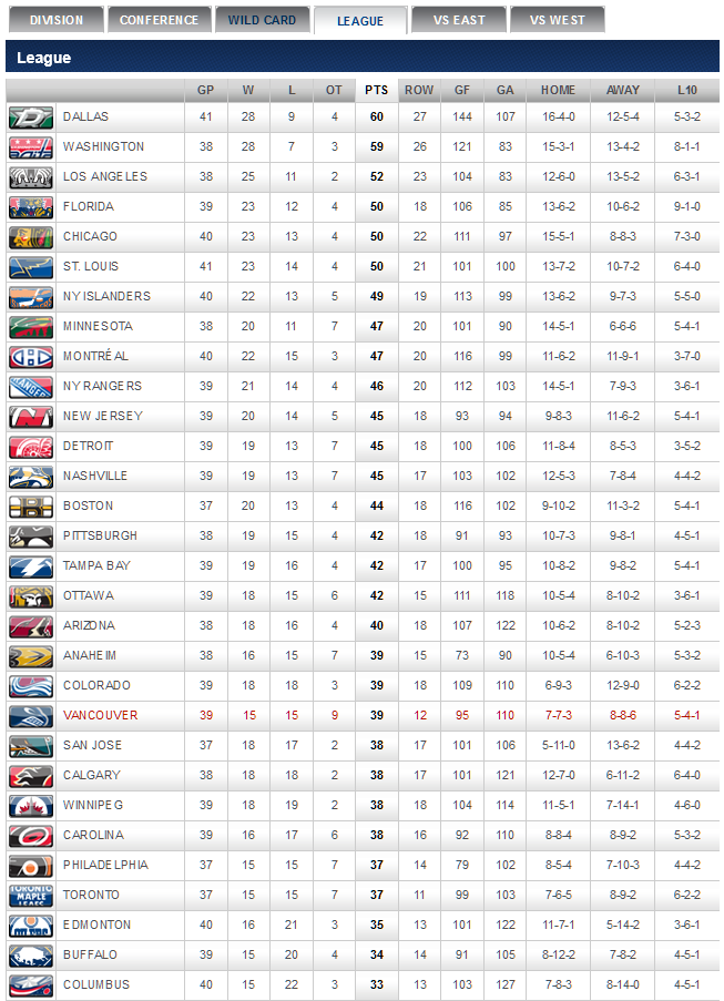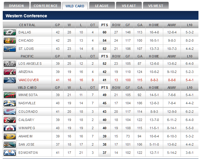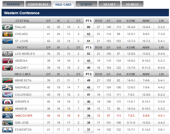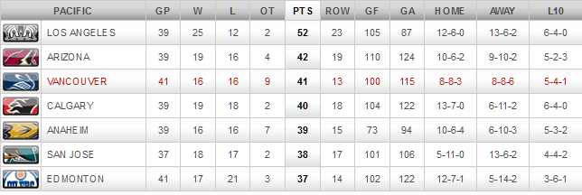 Vancouver sits in 4rth place in the Pacific division with 39 points, tied for 3rd place with Anaheim, 13 points behind the Kings in 1rst place. Canucks are a point behind Arizona, and a point a head of San Jose and Calgary; 4 points in front of Edmonton.