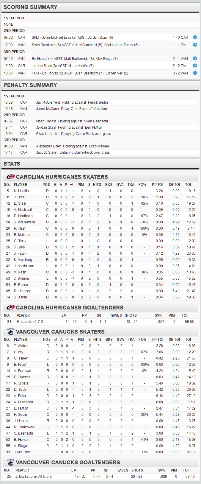 Carolina would pull goalie Eddie Lack but the Vancouver Canucks would hang on for the 3-2 victory on home ice; their third victory on their seven game home stand, with two games left.