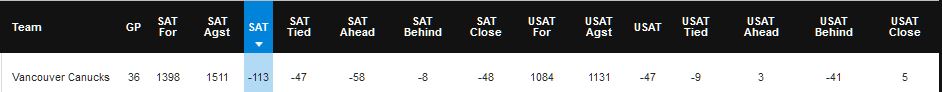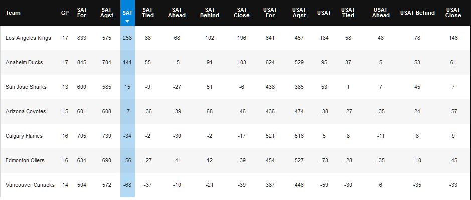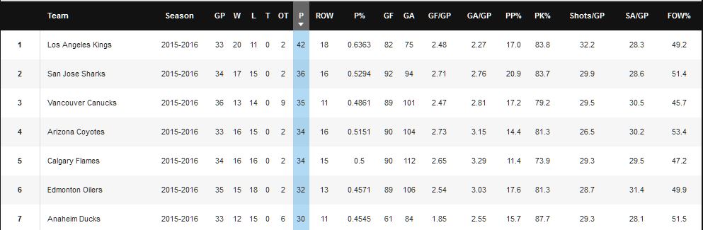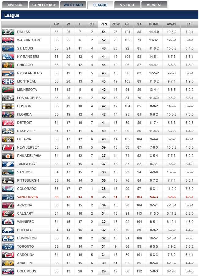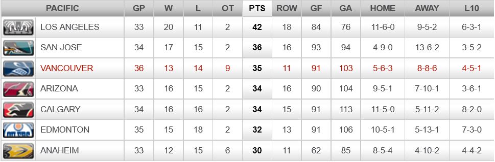 San Jose has three games in hand on the Canucks; Los Angeles, Arizona, Anaheim and Calgary, each have two games in hand on Vancouver.