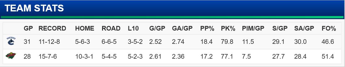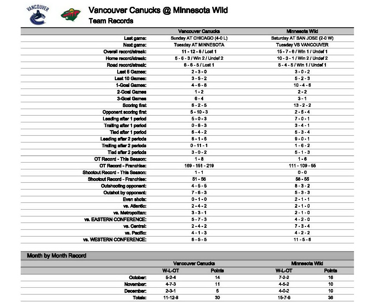 Vancouver has been outscored 35-16 in going 1-6-3 in its last 10 on the road. Their only win at Minnesota on Nov. 25.