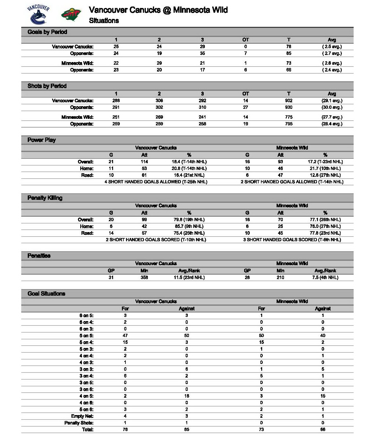 The Canucks penalty kill is 3 for 7 (42.7 percent), allowing 4 shorthanded goals against Chicago and Minnesota; and are 0 for 3 on the power play, all against Chicago, after failing to get a power play opportunity against Minnesota: the first time that has happened this season.