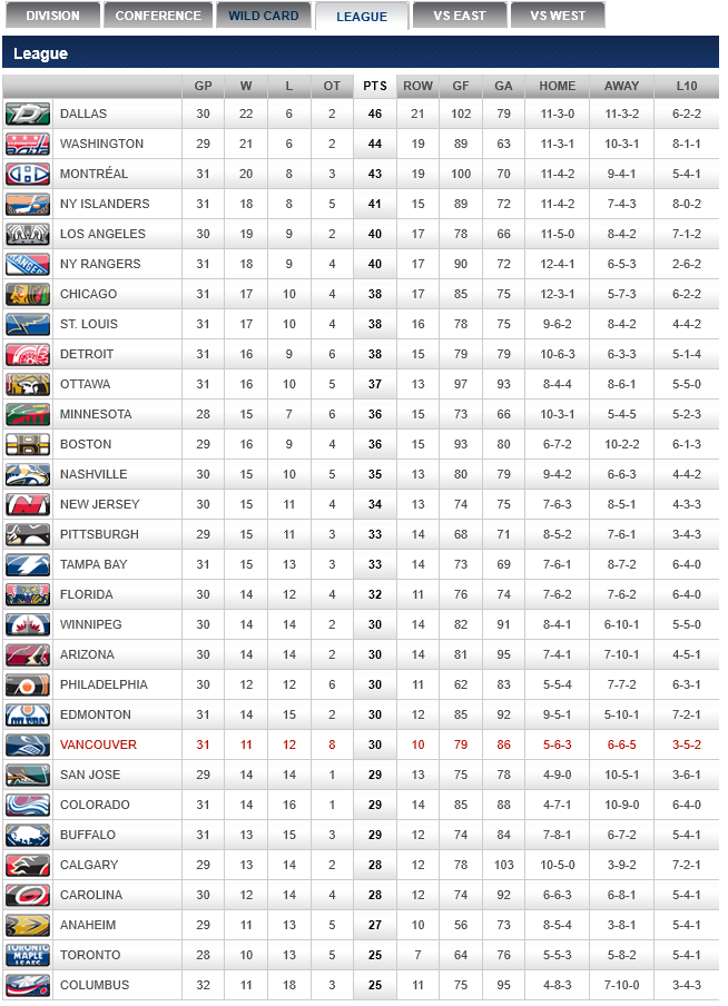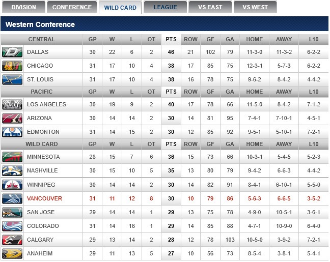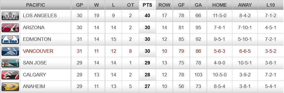 Vancouver currently is in 6th place in the Pacific division of the Western Conference with 30 points, just three points ahead of Anaheim in last place. Anaheim has 3 games in hand on the Canucks; Los Angeles, San Jose, Arizona and Calgary, all have 2 games in hand on Vancouver.