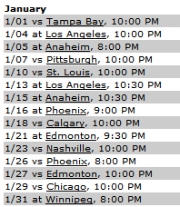 As you can see by the schedule for January, the Canucks first eight games have some strong opponents, with five games on the road and three at home.