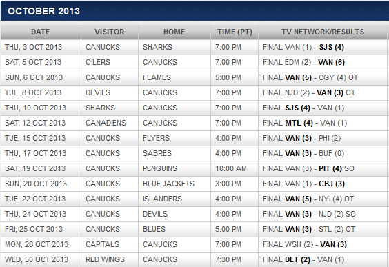 Canucks record in October, 2013: 9–5–1 (Home: 3–3–0 ; Road: 6–2–1)