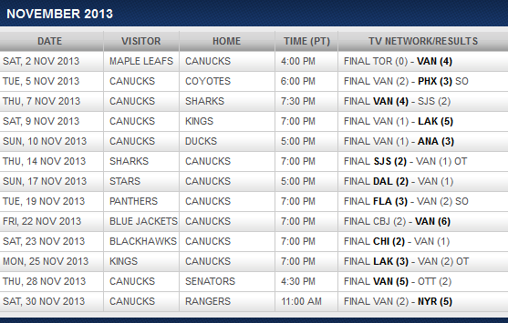Canucks record in November, 2013: 4–5–4 (Home: 2–2–3 ; Road: 2–3–1)