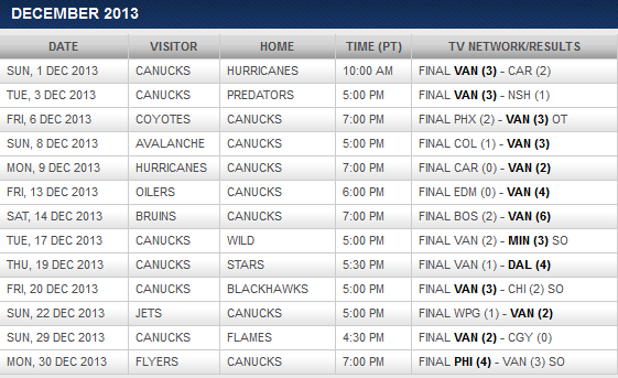 Canucks record in December, 2013: 10–1–2 (Home: 6–0–1 ; Road: 4–1–1)