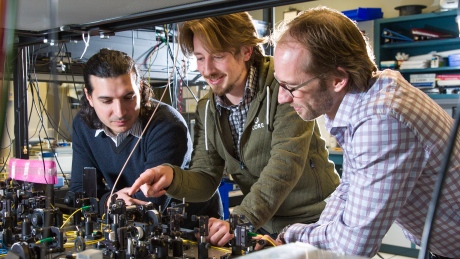 From left, postdoctoral fellows Daniel Oblak, Erhan Saglamyurek and physics professor Wolfgang Tittel, look over lab equipment. Their team recently published a paper on quantum computing advances. (Riley Brandt/University of Calgary)