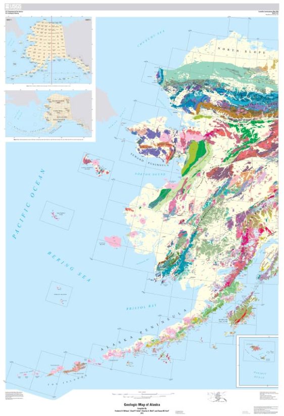 Wilson, F.H. et al. 2015. Geologic map of Alaska: U.S. Geological Survey Scientific Investigations Map 3340, pamphlet 196 p., 2 sheets, scale 1:1,584,000; doi: 10.3133/sim3340