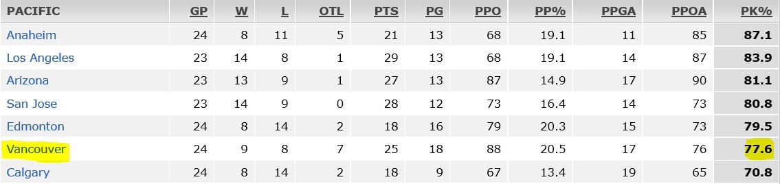 The Canucks penalty kill has been abysmal over the last 13 games, giving up 14 goals on 46 opportunities. Canucks have allowed 17 goals in 76 penalty kill opportunities, for 77.6 per cent, 22nd in the NHL.