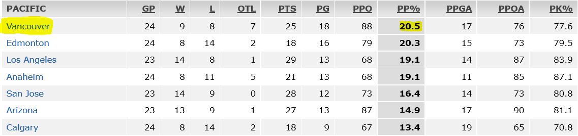 Canucks are 18 for 88 man advantages in 24 games, for 20.5 per cent, tied for 10th best.