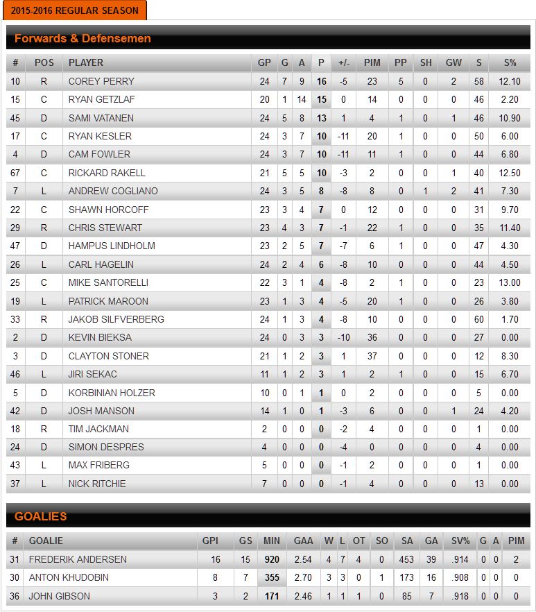 For Anaheim, Ryan Getzlaf and Corey Perry, with 14 and 13 points in their last 14 games, lead the Ducks.