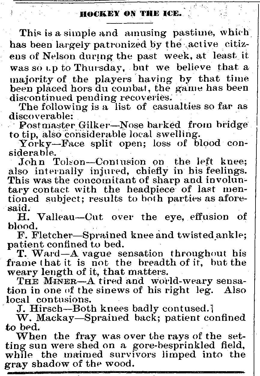 It seems that the earliest indication of hockey being played in the Kootenay area may have been in 1893 in Nelson, B.C., as this newspaper article recounts.