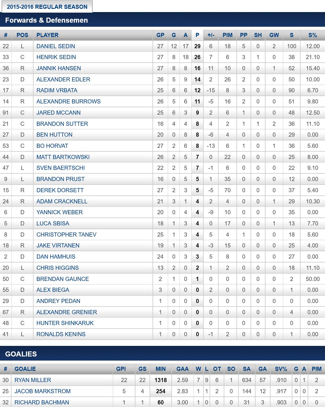 CANUCKS PLAYERS STATS
