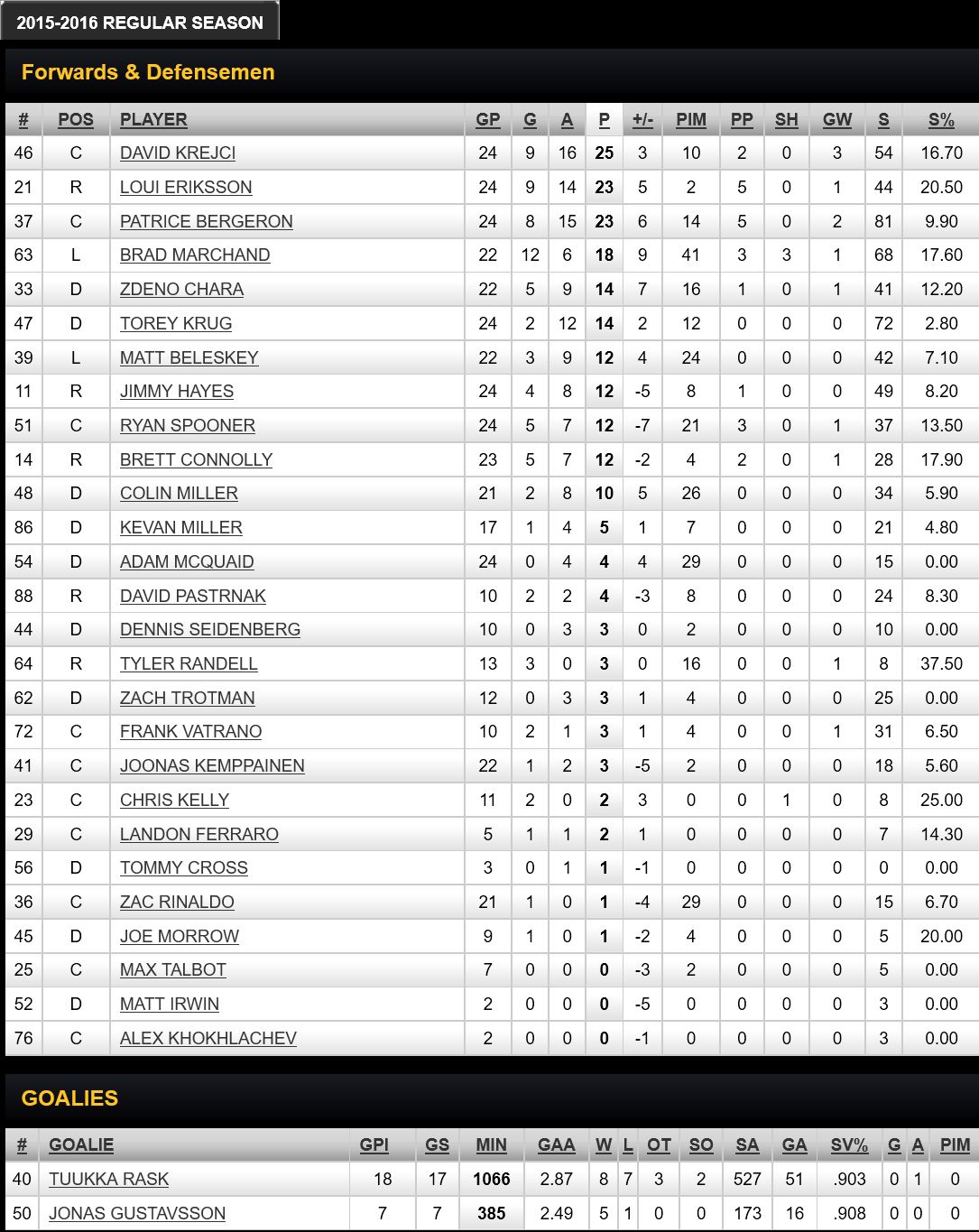 In 2016, Canucks point leaders: