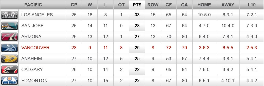The Canucks move into 2nd place in the Pacific division of the Western Conference, ahead of Arizona and tied with San Jose, with 51 points. Vancouver are 4 points ahead of Anaheim and 10 points behind the first place Los Angeles Kings.
